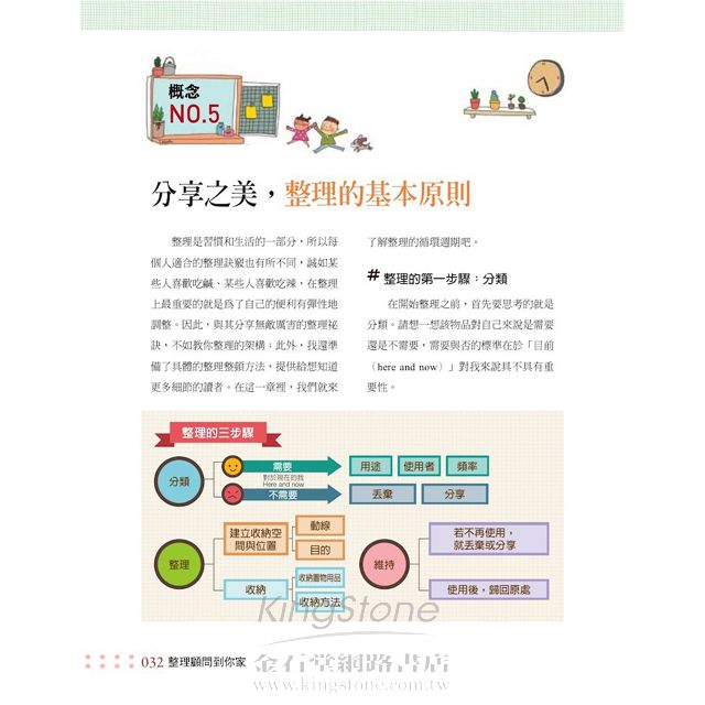 許多人愛讀的暢銷箴言書《小王子》裡,有段關於建立關係的故事。故事透過狐狸告訴我們,人是相互適應的,也就是說,人是活在自己與其他事物間不斷建立的關係中。我不認為這種關係僅是存在於人與人之間而已,我們所使用的許多東西也是與使用者產生關係、相互適應的,因此,為了過有效率有組織的生活,當然得好好調度這些必需之物來為我們服務。現在能了解整理的重要性了嗎?很多人對整理經常有誤解與偏見,抱持「整理不過就是件誰都會做的家務事」的想法,只要聽到整理,就想到打掃家裡或做家事,但是整理真的只是件家務瑣事嗎?