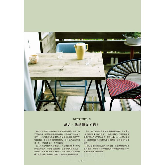 作者認為DIY,就是為了作出更方便使用的東西,是為了追求更舒適居家生活的小小工藝。既然要作,就要作外型漂亮、又容易作的,所以,本書只介紹製作方法簡單的物品,希望可以讓大家更喜歡室內裝飾及居家改造設計!