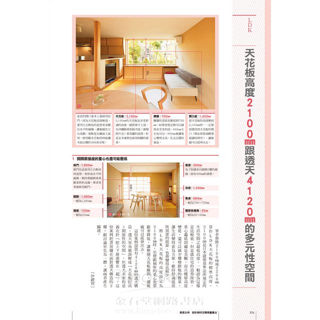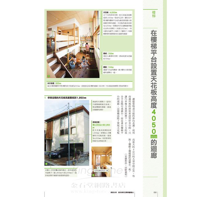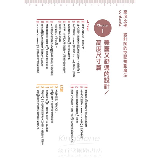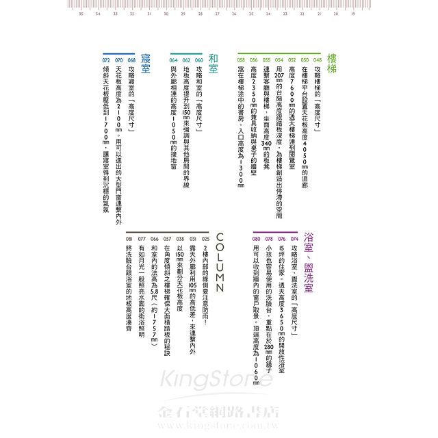 設計師們依照空間用途,在書中歸納出了樓梯、和室、寢室、浴室等六種空間類別,讓讀者可以依書中之具體事例,輕鬆地掌握不同空間規劃的準則!