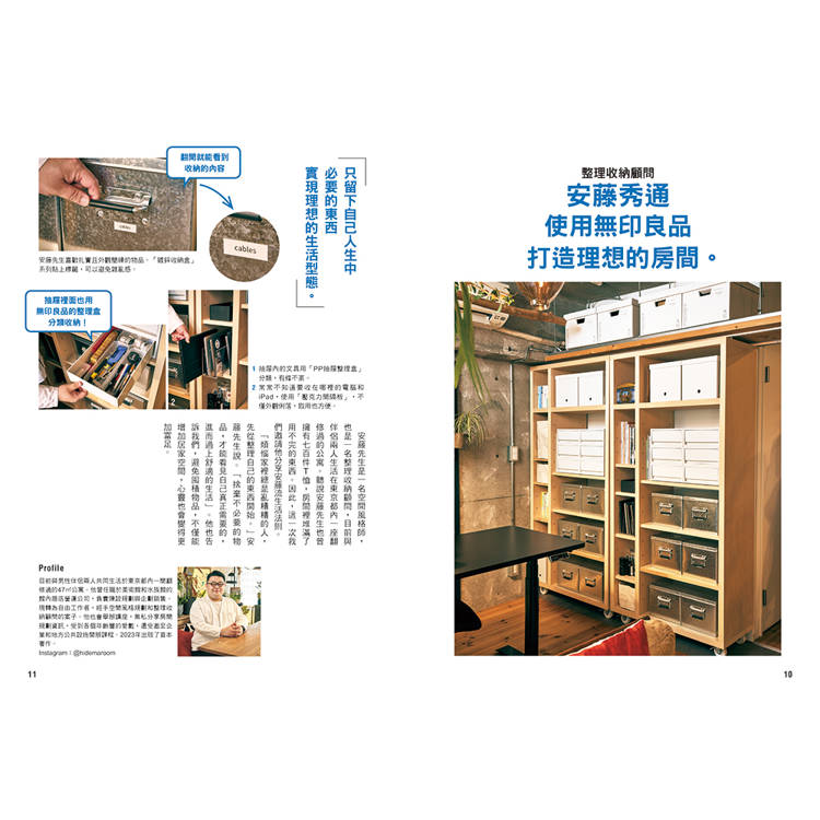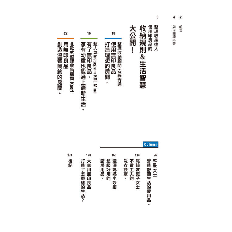 本書採訪了許多整理收納顧問、人氣Instagramer以及其他使用者,介紹他們如何使用無印良品的商品,打造清新舒適的生活環境。