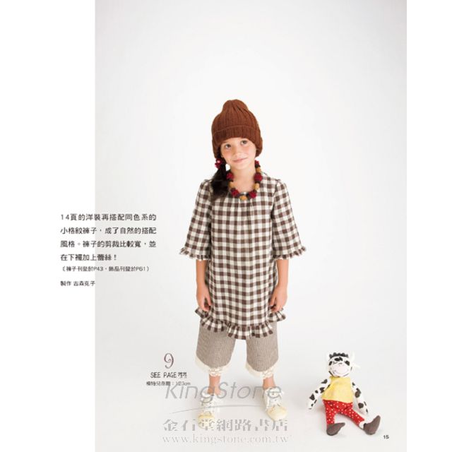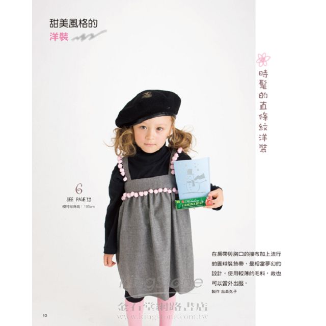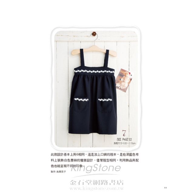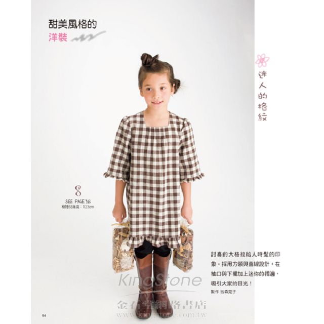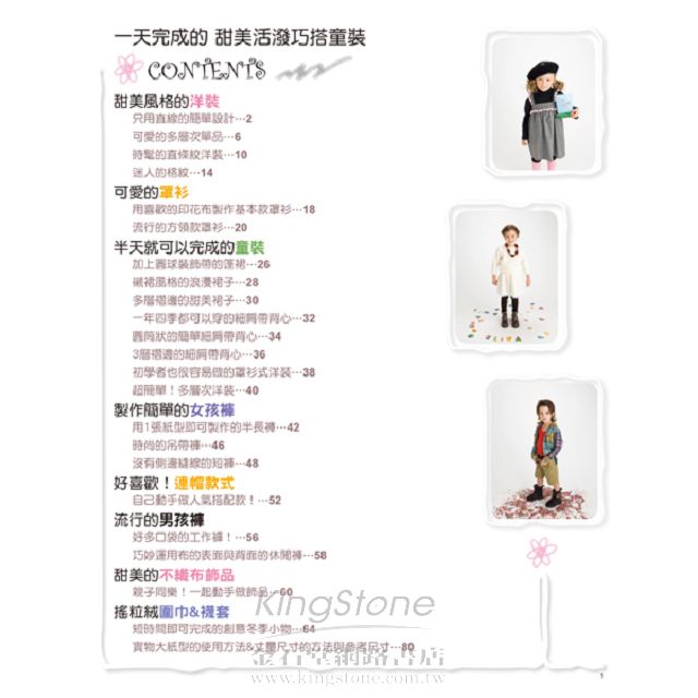 本書收錄多款一天或半天可完成的可愛童裝,包括各式各樣的洋裝、裙子、男生女生都可以穿的褲款,以及髮飾、項鍊……等實用小飾品一共45款。