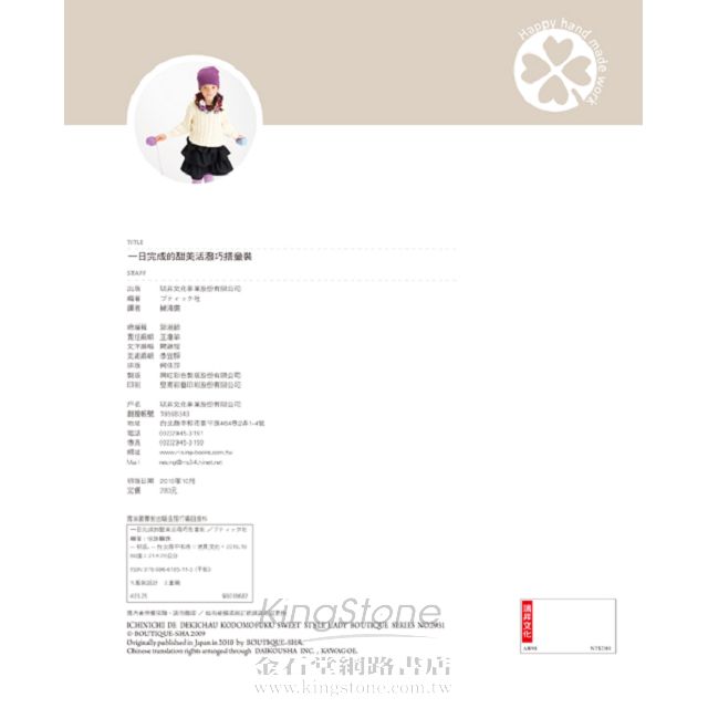書中搭配彩色插畫進行步驟詳解,分解圖簡單不複雜,即使是不熟練的人,只要跟著書中步驟,Step by step,也可以完成專屬於家裡寶貝的可愛衣服。書中貼心附贈紙型,讓製作更為輕鬆方便。