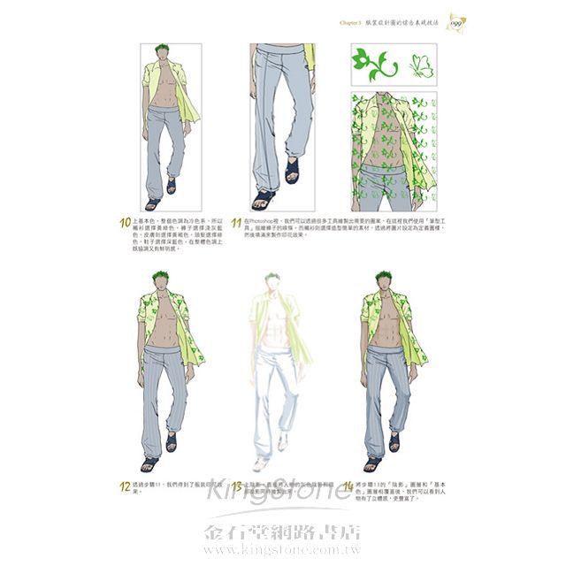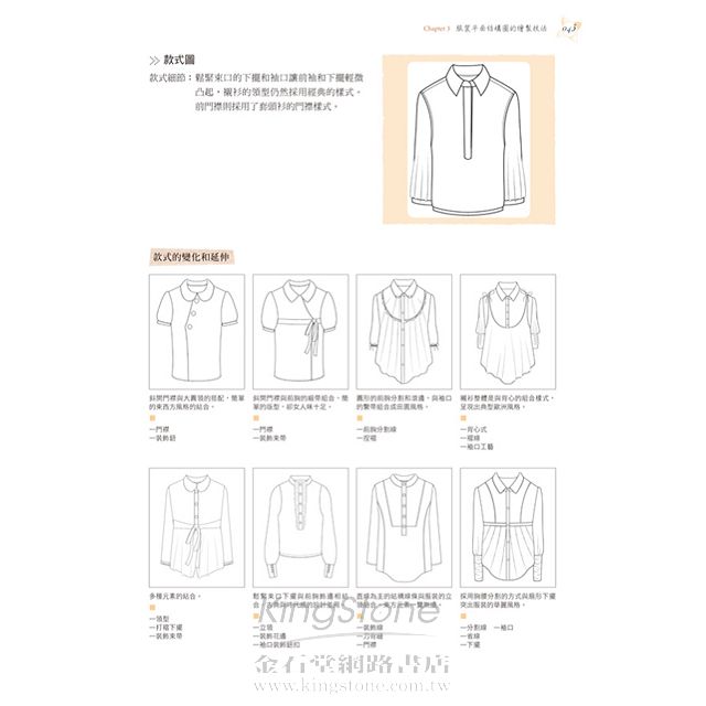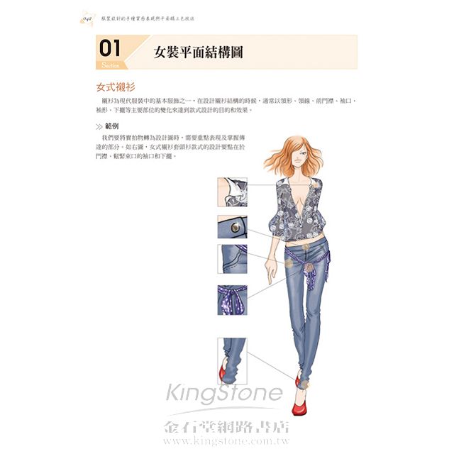 其中亦包含襯衫、毛衣、大衣、長褲等上百款男女各式服裝的平面造型結構圖;五十幅完整介紹繪製方法的服裝設計圖;數十種不同質料、造型、配件互搭的表現技法。不管是經典款服裝或是流行款服裝,應有盡有,是服裝設計初學者、服裝設計相關科系及從業人員的參考好書。