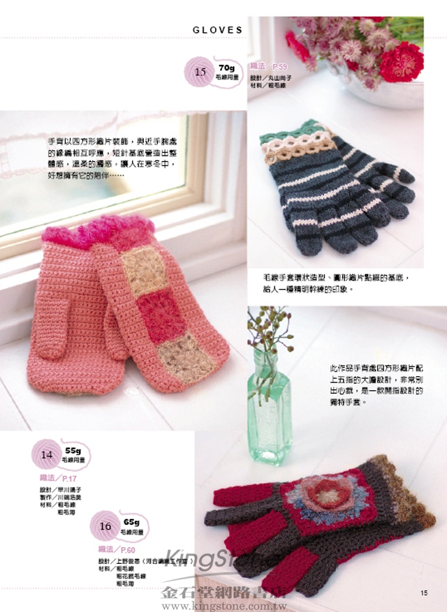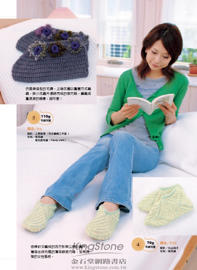 1. 一次給您40種變化的毛線小物,包含有毛線襪、室內鞋、髮帶、披肩、胸花、圍巾、帽子、斗蓬、短版小外套,還有以毛線織片改造的各式配件之實用小飾品。