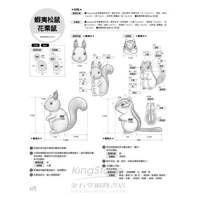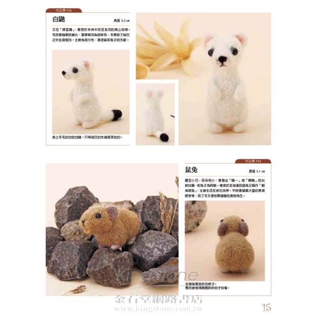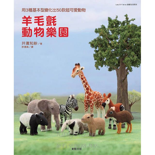 羊毛氈的色彩變化豐富並具有柔軟觸感,非常適合用來製作動物。本書作者是美術大學畢業,對於動物外觀有敏銳觀察力,所以設計製作的各種小動物都逼真可愛。本書教導鼯鼠、兔子、長頸鹿、斑馬、企鵝、小鳥等50種動物作法,除可當作擺飾,加上金屬釦環等,還可以變成鑰匙圈或手機吊飾。只要學會書中3種羊毛氈基本型,即可變化出各種喜愛的小動物。