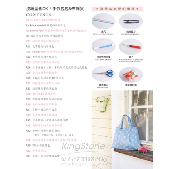 除了各種款式的包包之外,還有布簾、餐墊、枕頭套……等可用於日常生活中的實用雜貨。這些作品沒有複雜的形狀,連紙型都不需要,只要利用直接畫線、裁剪的「直裁法」就可以製作!