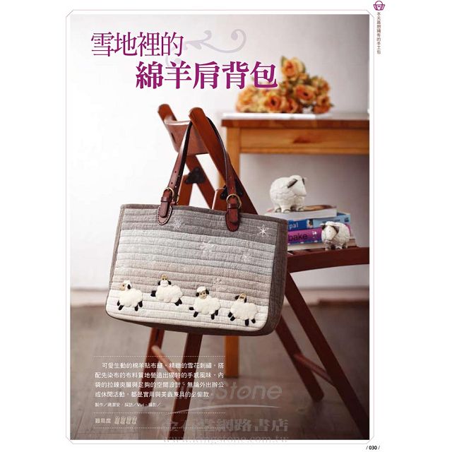 針對聖誕節日的應景作品有聖誕馬靴襪、插畫風格蠟燭墊、聖誕雪人多層次工具袋等作品;實用包款部分為大家設計幾款別緻的小包,如巴洛克典雅隨身包、小婦人古典口金包、冬之雪迷你口金包等;在家居生活方面,著重在不複雜但實用性與可愛度很高的作品,如暖暖熊小蓋毯&抱枕、歡喜獅腳踏墊、夢想飛行帽等,保證讓你和家人擁有一個溫暖的冬季時光。