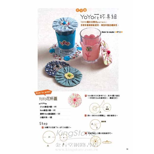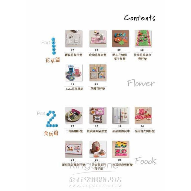 本書主題是由一小塊圖案衍生出來的「杯墊」設計,這些圖案的創作靈感包含花草、食物、動物、傳統拼布、異想…等各式各樣的素材,完成品除了杯墊創作,還包括各種廚房餐桌墊、隔熱手套,以及延伸進階的束口袋、手提包、保溫壺套、圍裙等多種實用生活雜貨。
