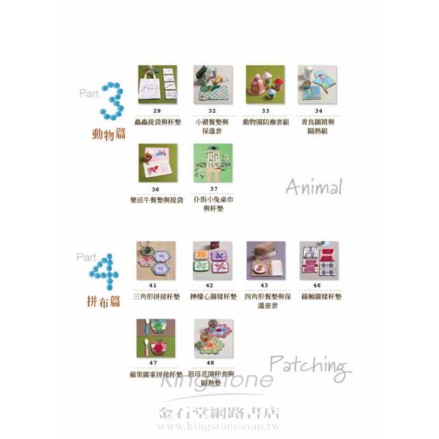 ◎全書56款、105件不同創作,讓讀者學習小圖案的縫紉技巧,同時進行大圖案的組合設計。