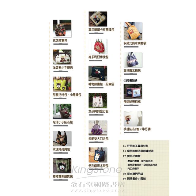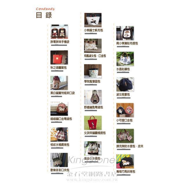 將貼布縫應用在作品上,讓作品產生不同的質感和個人專屬的特色,是替作品增值的捷徑,本書介紹的包款,從懷舊的口金包、外出用寶特瓶束口袋、便利兩用水餃包與雙面包、收納式防水購物袋、清新學院氣息的書包、大容量的旅行包、以及深受女孩們喜愛的水桶包,大大小小的款式都有詳細的作法解說,除示範每款作品的貼布圖案之外,讀者也可以運用附錄的紙型圖案做替換或增加不同的設計。