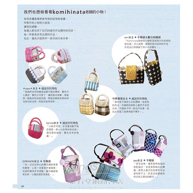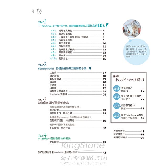 本書作者-杉野未央子老師,原本只是個熱愛拼布,喜歡手作小物的手作作家,在某一天忽然燃起建立手作部落格的欲望,一股衝動之下,以家人名字組合而成、名為「Komihinata」的部落格,便如此誕生了!