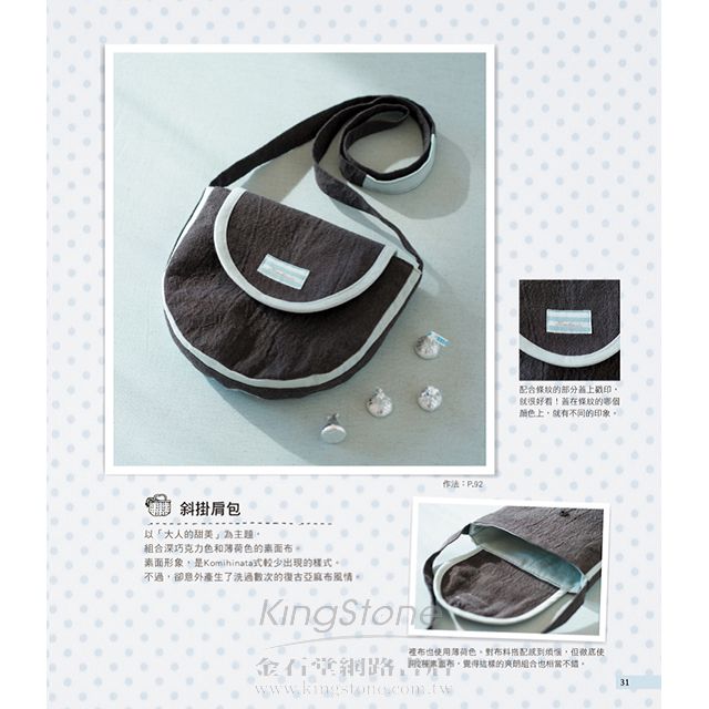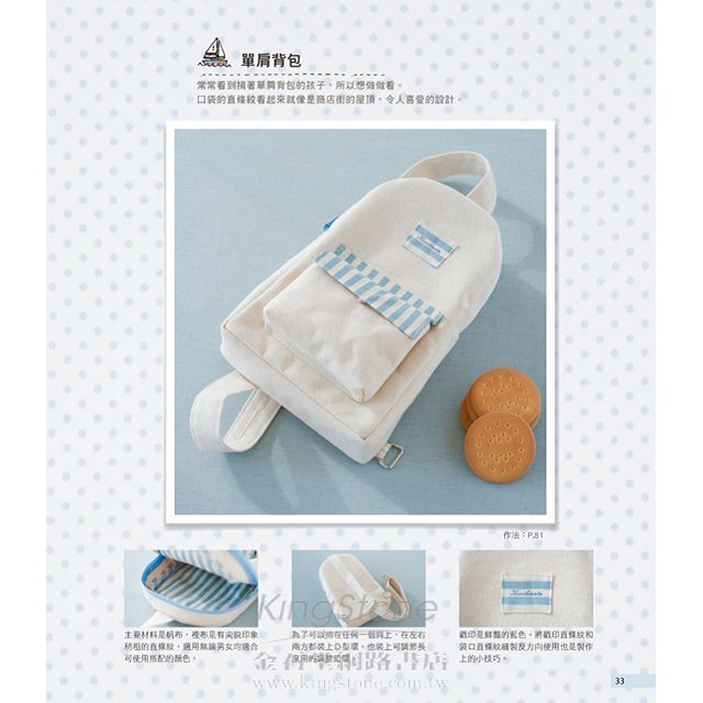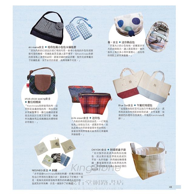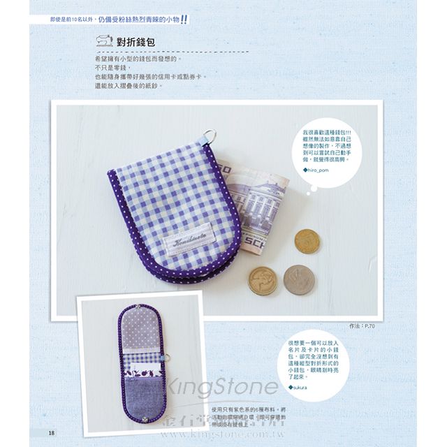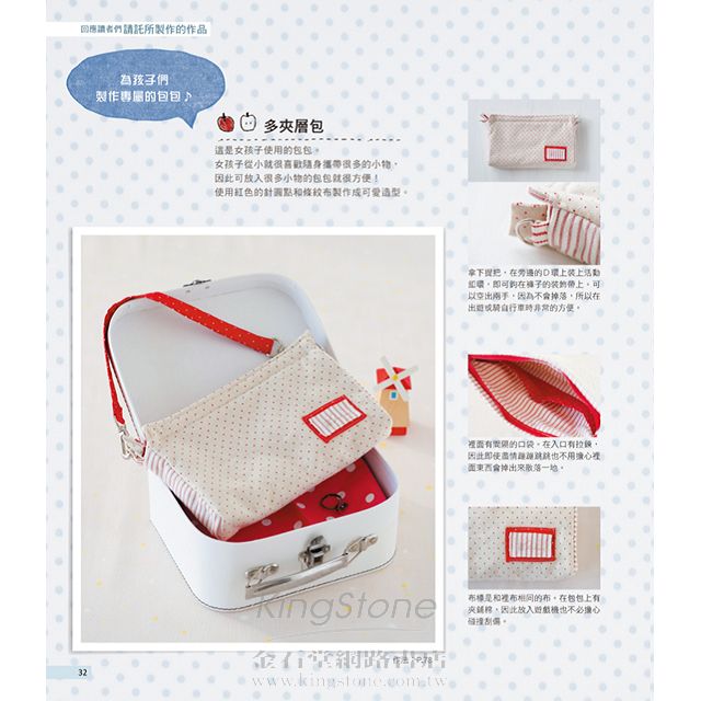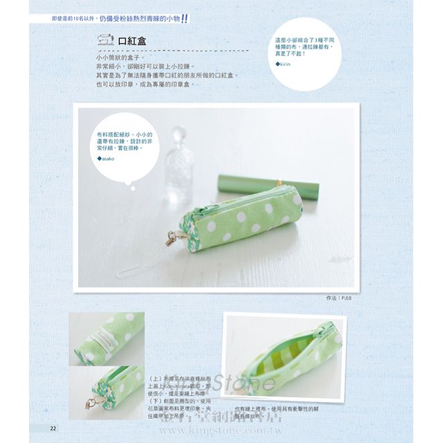 本書收錄了小提包、手機袋、錢包、鉛筆袋、鑰匙袋、口紅袋、化妝包…etc多款手作雜貨,您是不是剛好就缺少其中一種呢?快動手作看看吧!