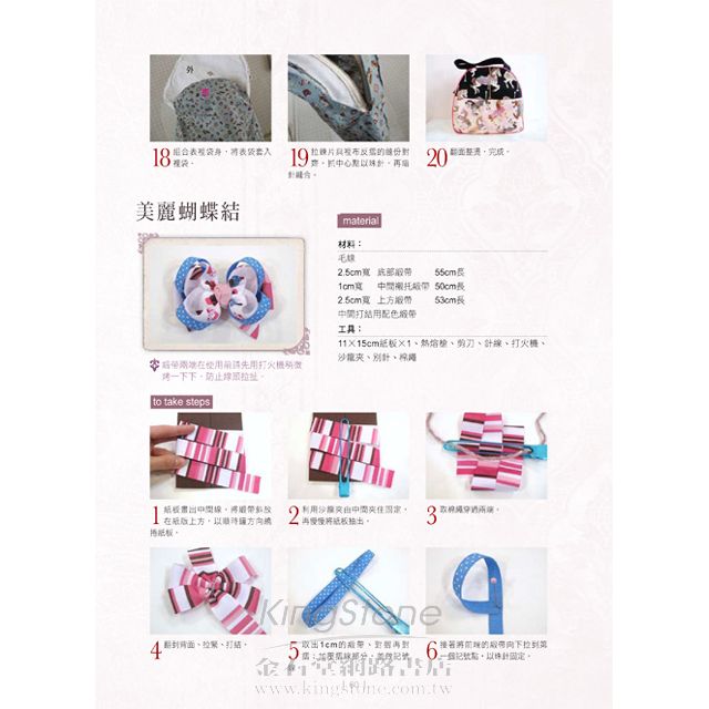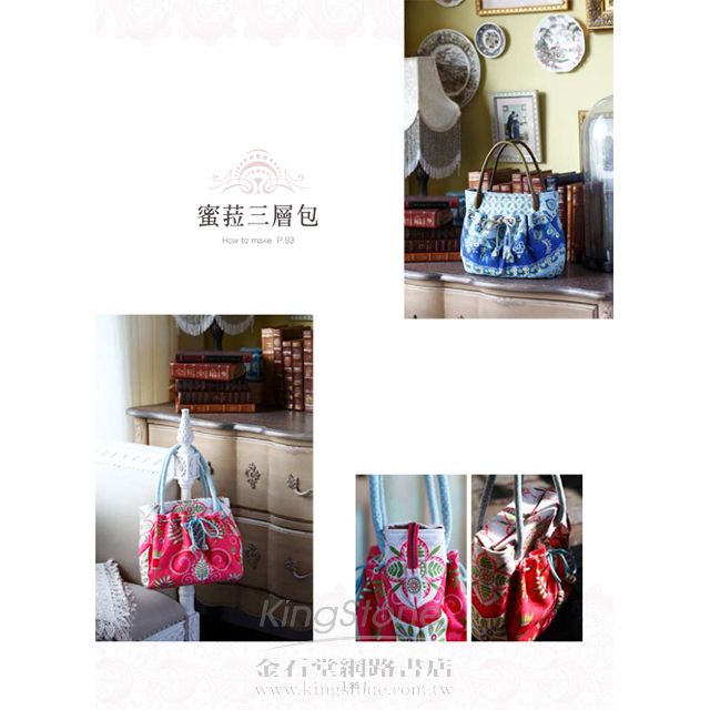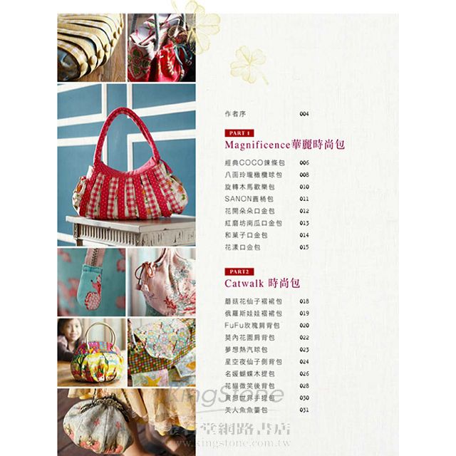 作者注入歐美流行的元素,將經典包款以不同的剪裁設計、拼接及車縫技法,讓復古內斂的經典款再次呈現出優雅名媛風;另外以創意結合軟性材質的緞帶,再善用局部抓褶的特性,展現出令人驚豔的低調奢華,即使是平民化的大書包、媽媽包等,都能別出新裁的設計出符合都會的時尚感。