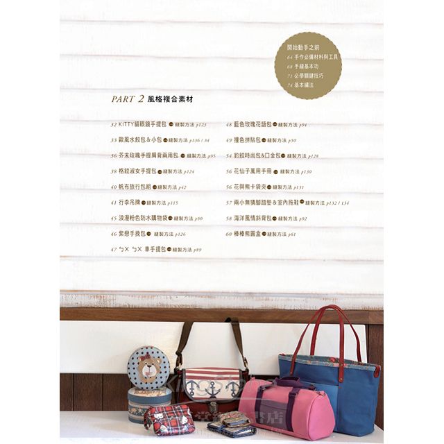 ◆以棉布、帆布、皮革、防水布為主題素材,介紹各種布料的材質特色,無論裁縫技巧與製作細節的心得,都有詳細說明。
