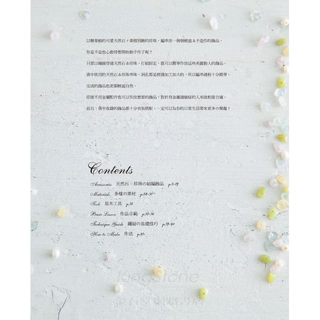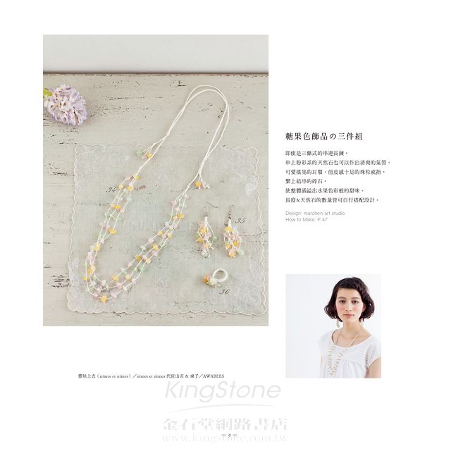 將糖果般的可愛天然石+素雅別緻的珍珠,以簡單的繩結技巧+打結固定,創作出自然的氣息&低調的華麗優雅,編織出許多美麗動人又氣質滿分的飾品配件。書中收錄的飾品都十分容易搭配,且兼具了輕盈&不造作的質感,配戴穿搭時,可是會引來熱烈詢問喔!