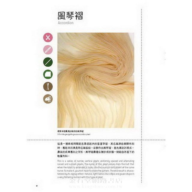 利用相同的初步概念,只要發揮想像力與個人創意,遂能變化出無數的完美圖樣,布料種類繁多與褶的立體多變,更讓創意全然不受限制。本書收錄的活褶照 片,呈現出適用各項技巧的不同布料,手繪服裝圖片則說明方法步驟。本書的撰寫目的為拓展讀者對手折布料的認知,同時向讀者證明手折布料並不困難,更能讓讀 者體會到不僅簡單又有效率,好的開始正是順利完成作品的關鍵。