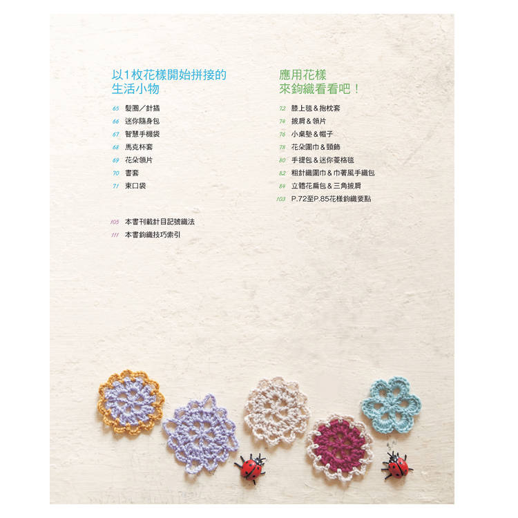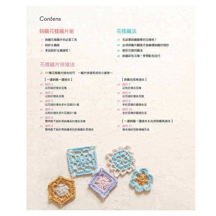 除了織片鉤織基礎篇,亦規劃了同樣詳盡的11種織片拼接技巧,與22款可愛應用實作,讓新手能更上一層樓,擁有運用所學,完成鉤織作品的能力!