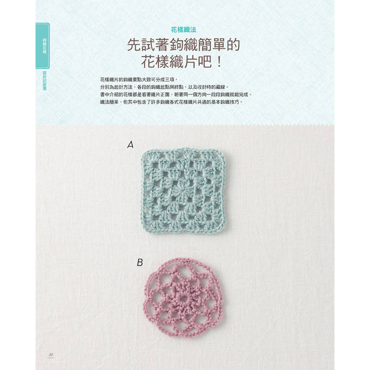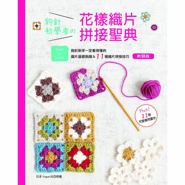 花樣織片是鉤針編織裡十分簡單易學的入門技巧,短時間就能完成的小小織片,拼接起來卻又有無限可能。本書從基礎的認識鉤針、線材、工具、織圖閱讀方法開始,循序漸進地詳細說明。初學者鉤織時的容易產生疑惑的地方,例如:起針如何開始?這段鉤完怎麼收尾?如何進入下一段的針目等……這些經常讓初學者慌張困惑,又難以用文字說明清楚的轉折之處,都以各款花樣織片的實際編織為例,運用插圖搭配分解步驟照片的方式,讓讀者看得清清楚楚。並不時提點針法變換訣竅、加減針、換線等技巧。