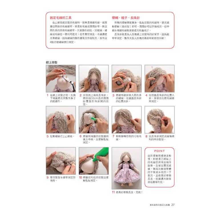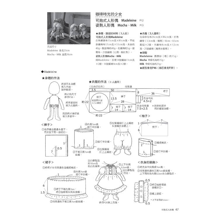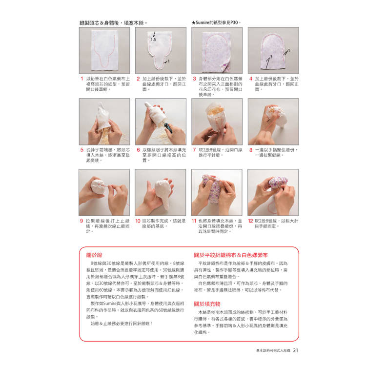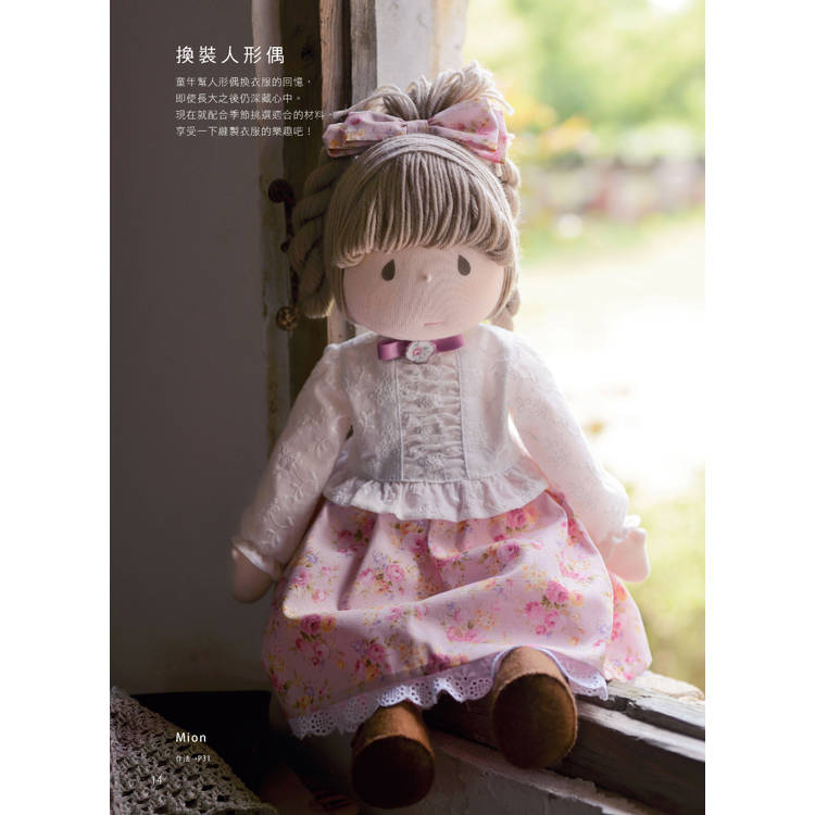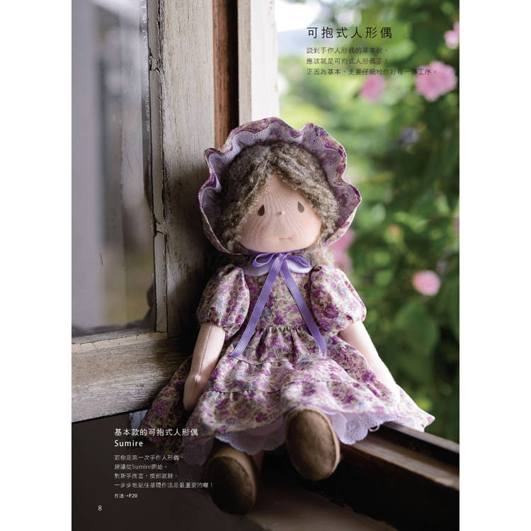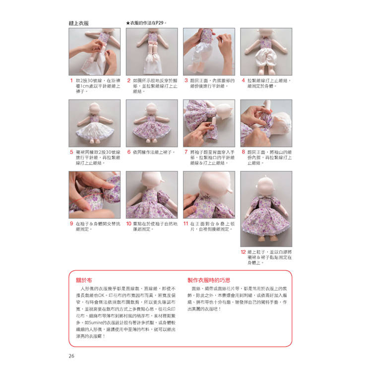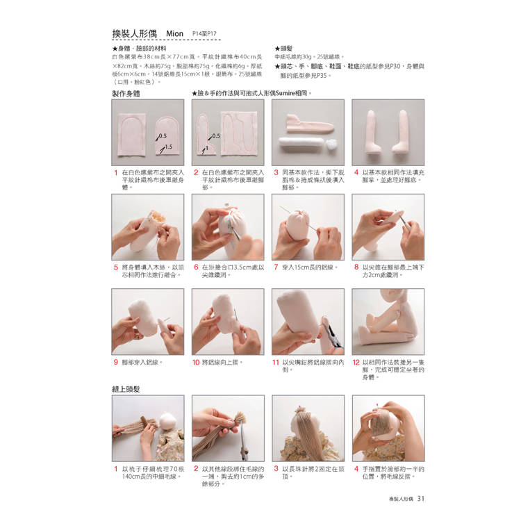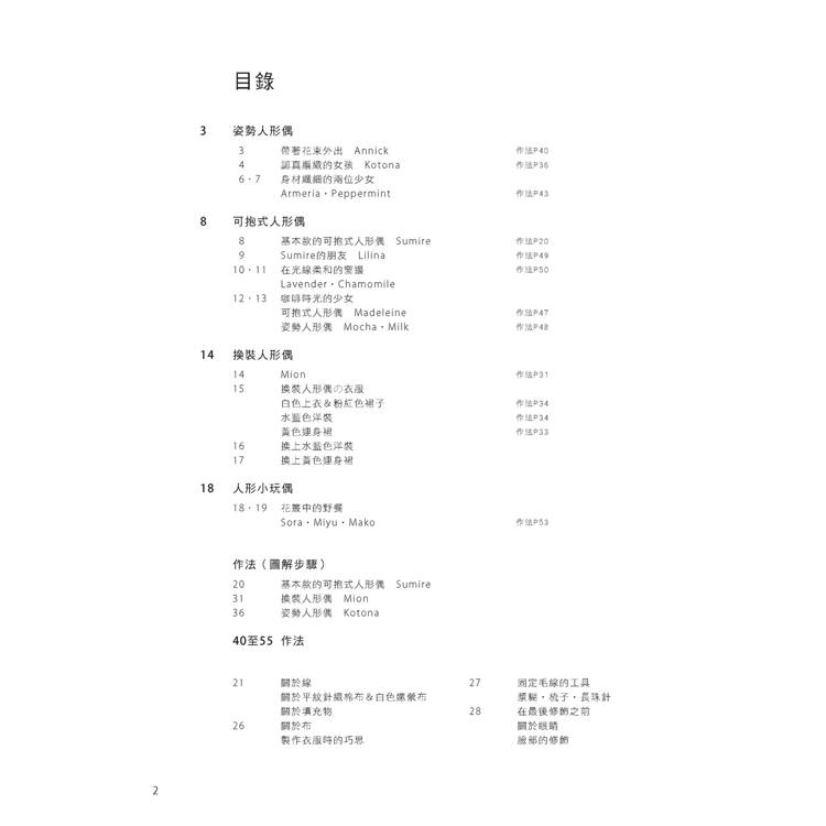 以此四種基本作法即可作出布置擺飾、陪伴娃娃、換裝娃娃等不同的類型,且針對不同作法皆以詳細的分解步驟圖進行示範解說;從人形偶主體的製作、充棉&身體組件的接連方式、頭髮造型&臉部表情呈現,到衣服的縫製&接縫皆有教作。請跟著作者的詳細解說&重點提點進行縫製,作出專屬於你的可愛人形偶吧!