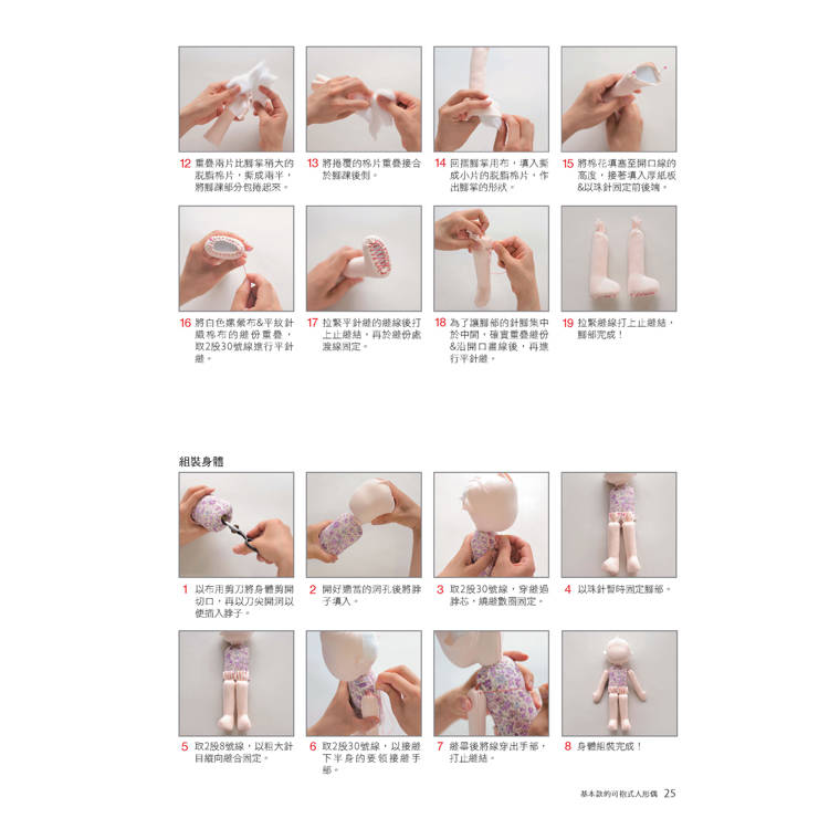 主體除了以一般的接縫方式製作之外,部分作品也在手腳中包捲入鐵絲或鋁線,讓人形偶的姿勢可以更加豐富。若將人形偶的手部作得更加細緻,在五根手指的充棉中一一捲入鋁線,還能讓人形偶作出如持花、編織等生動的姿態喔!