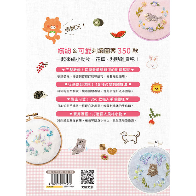 想要動手刺繡,卻不知道從何下手?書中教你用10種最常用、最容易學的刺繡針法,輕鬆變化出350款繽紛Q萌的圖案,搭配繡法圖示及文字說明,新手也能安心製作,完成一幅幅質感滿分的作品。