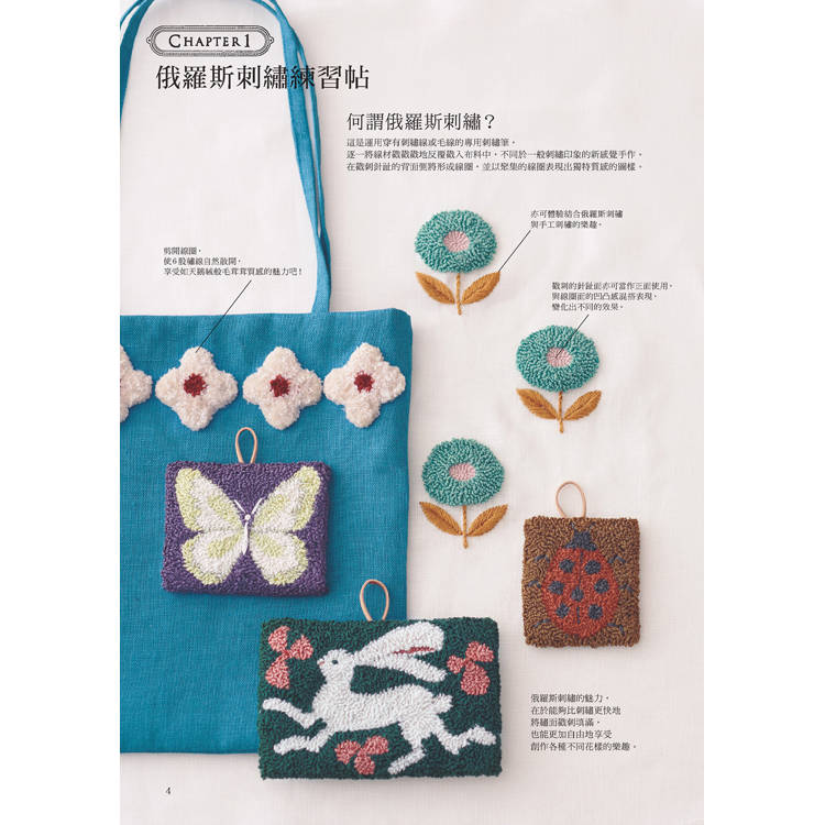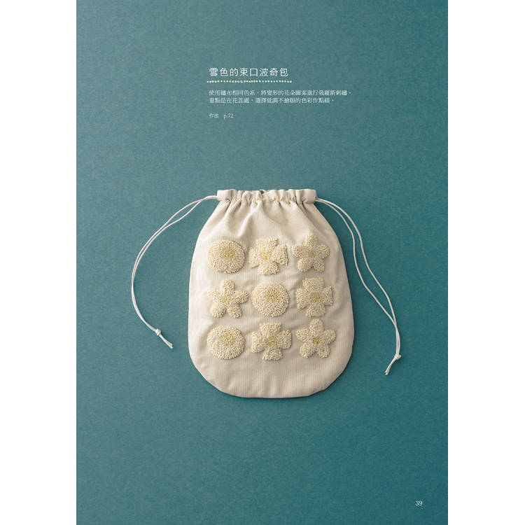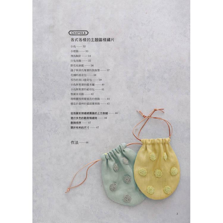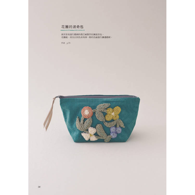 以單個圖形製作胸針、裝飾於布面、利用自己刺繡的布面縫製包包,都能讓刺繡的樂趣與成就感更加倍!