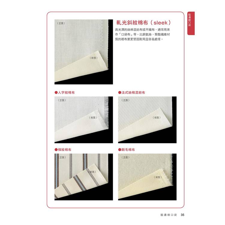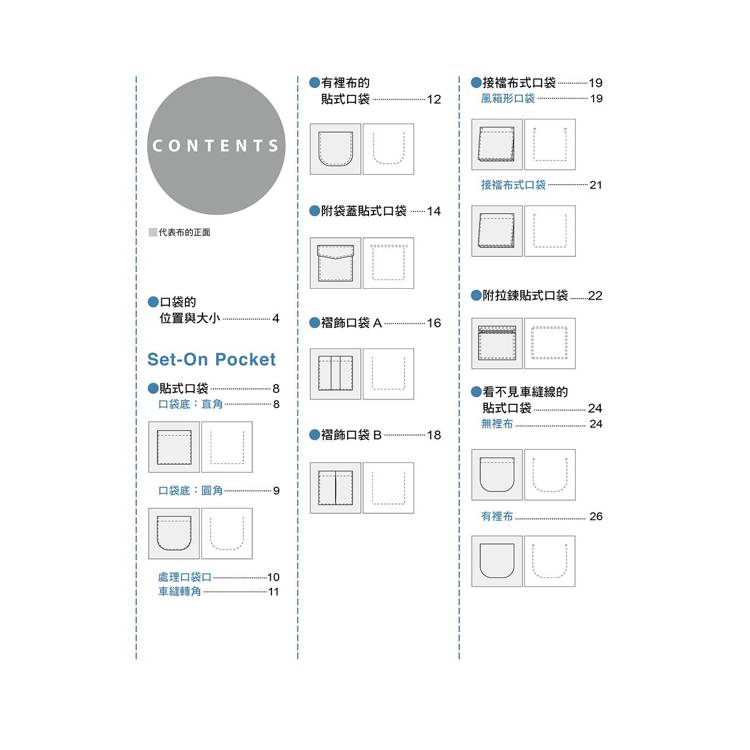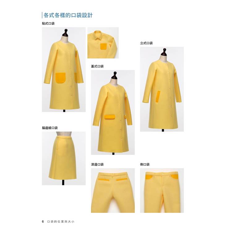 書中介紹了基本的貼式口袋、脇邊線口袋、切開式口袋;也有屬於變化款的側口袋、褶飾口袋、接襠布式口袋、滾邊口袋……等。簡單的款式只要再加上拉鍊、滾邊、袋蓋、褶子,或者形狀稍微變化一下,就馬上有了不同的風貌!