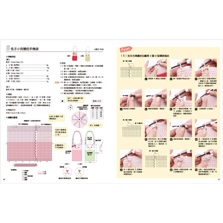 並清楚標示出織圖重點、容易忽略的細節,以及使用的毛線顏色與粗細、鉤針等,