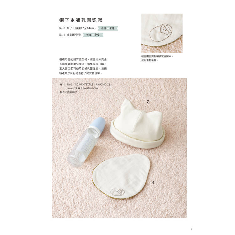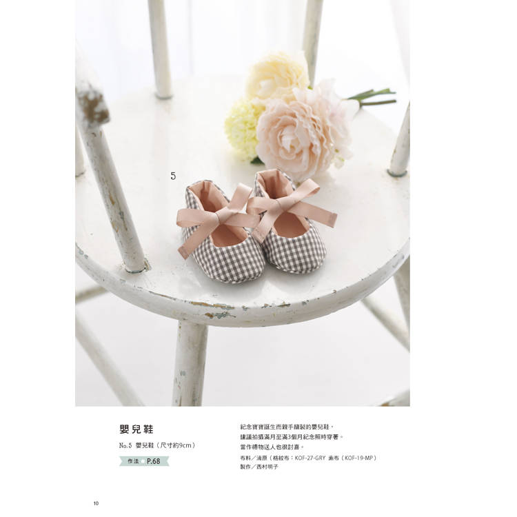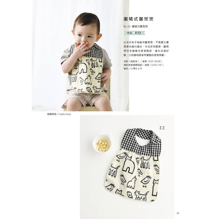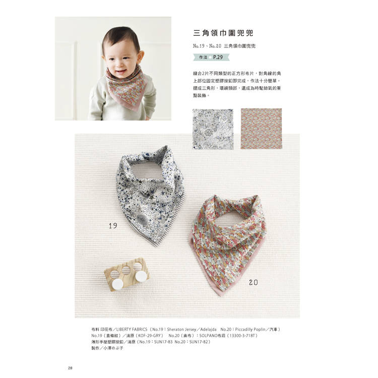 每日使用的圍兜兜、搭配衣物穿搭的嬰兒鞋、簡易的嬰兒衣物&小帽子、可收納物品的包包、可愛簡單的手搖鈴,作品的尺寸皆不會太大,拿在手上縫一縫,可以很快就完成喲!