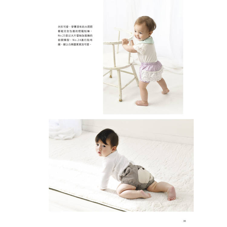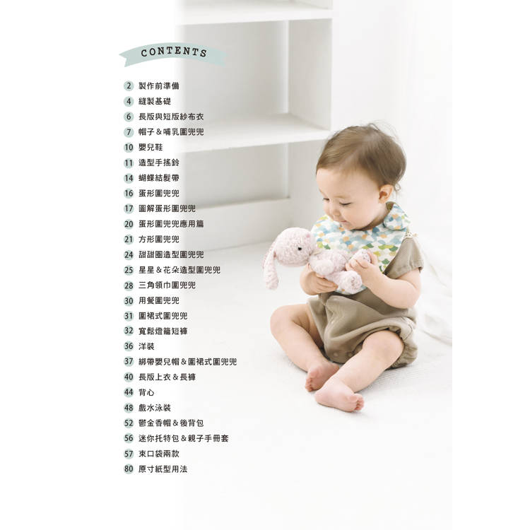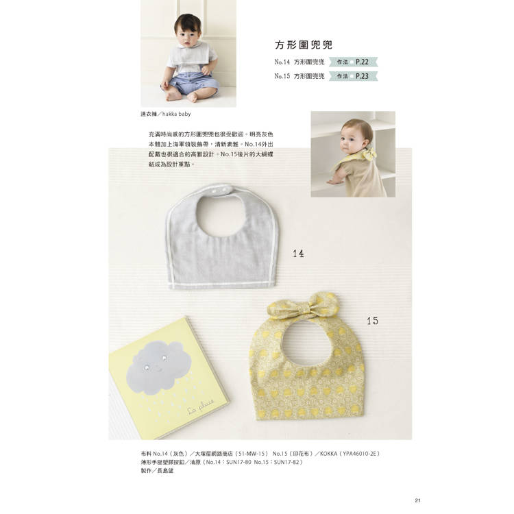 本書滿載38款寶寶出生前的必備貼身衣著與小物,可以穿戴至兩歲左右的圍兜兜與服飾、