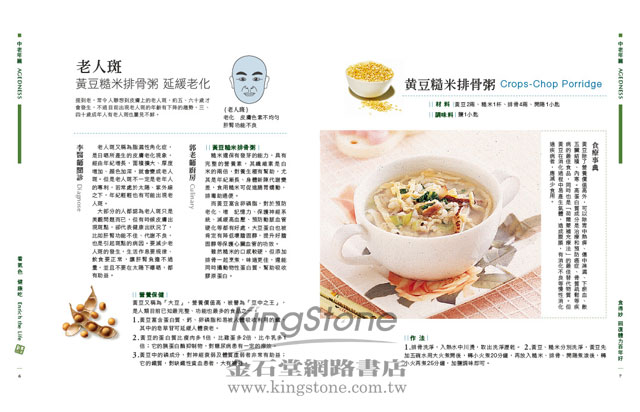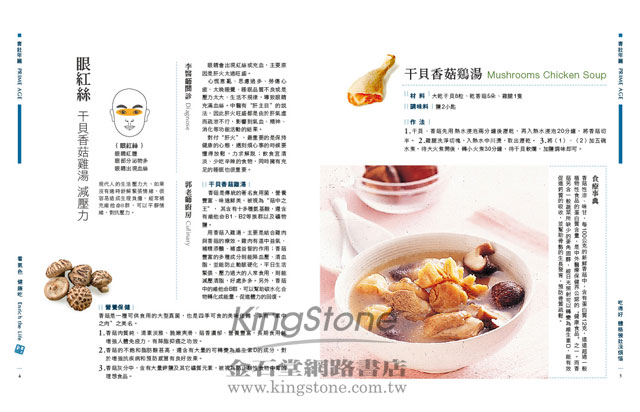 《看氣色,健康吃--李家雄.郭月英的中醫食全養生》的最大特色,即為結合中醫面診/養生料理兩大觀點,有別於坊間一般常見的單向養生食譜或中醫面相書,針對兒童、青壯年、中老年三大年齡層,指出55種五官行為特徵,比對55種常見病症與養生食譜建議,專業實用、深入淺出,另加上臉譜插畫圖文解說,讓一般讀者易懂易學,照顧全家人的生活健康。
