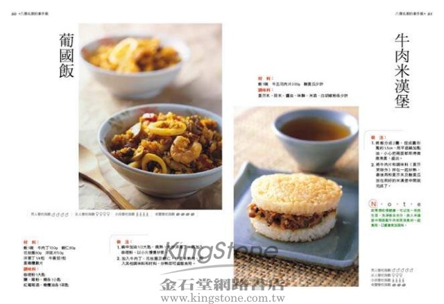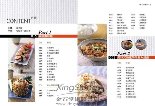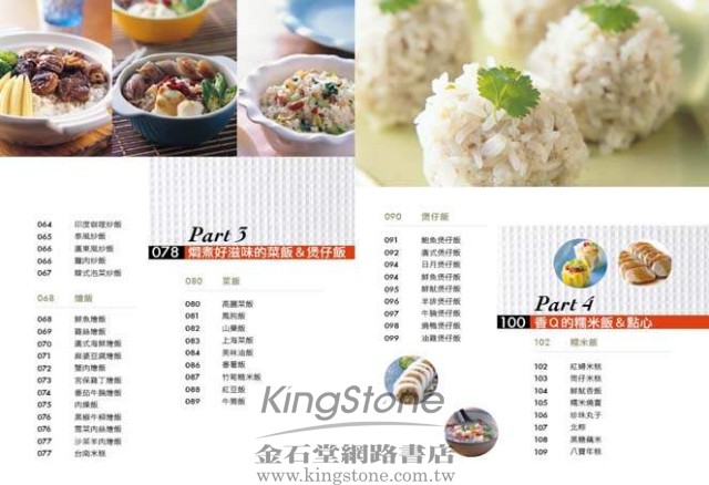 書中的米飯料理概分為4大類,從朋友比較陌生又常愛到外頭美食名店體驗的異國風味飯,像是壽司、飯糰、蛋包飯、丼飯、咖哩飯、焗飯,到國人生活中較常食用到的炒飯、燴飯、菜飯、煲仔飯,將各飯品的特色&製作要點做一介紹,除了主食類的米飯料理之外,還加入了一些經典的米飯點心,並且在做料理之前,先和朋友分享選米、買米、煮米的經驗,此外,於每個飯品之後都有一個男女老少的愛吃指數,希望能提供您在料理呷飯ㄟ代誌時一些個參考。 王政彰