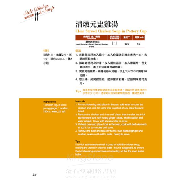 烤箱不再只能烤雞、烤魚或烤吐司,以同樣加熱的原理,烤箱也可以燉湯、煮飯、做料理。本書特別規劃了為人熟知的飯菜,例如港式臘腸煲飯、上海菜飯和油飯,也介紹了著名的西班牙海鮮飯、西班牙早餐蛋等。還有蛋黃酥、布朗尼、烤布丁和蘋果派等中西式點心,道道都是經典之作。