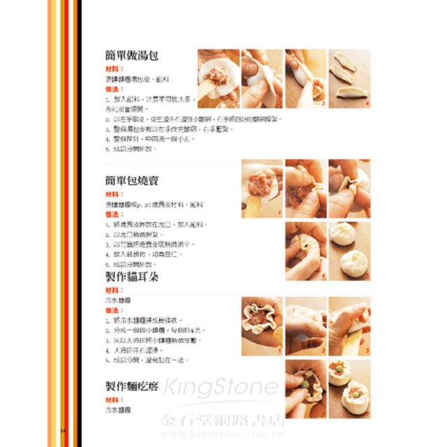 〈零失敗率超簡單的麵食〉:挑選新手即可迅速完成且成功率超高的簡易麵食,如各類水餃、蛋餅、煎餅和麵條等。