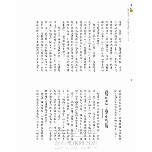 那麼,我的貴人是那些人呢?我開始說囉:陳鳳馨、趙少康、唐湘龍、趙政岷、鄭家鐘、王嶠奇、王克敬、韓嵩齡、張國立,當然,還有那些接受我採訪的所有主廚。我要強調,沒有這些人,沒有這本書。很俗!是吧?對!我就是個俗子,只喜歡採訪,不想做美食家的凡夫。■人生五味〈推薦序〉