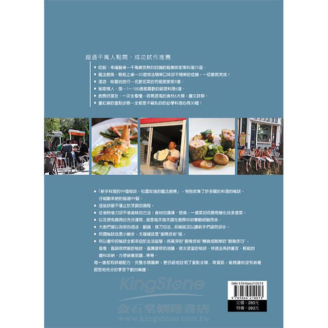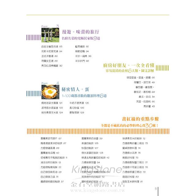 仔細數來絕對超過99個。這些訣竅不僅止於烹調的過程,從省時省力卻不省美味的方法;食材的選擇、替換;一道菜如何應用變化成多道菜,以及現有器具的充分運用...都是每天每天窩在廚房中的實戰經驗而來。