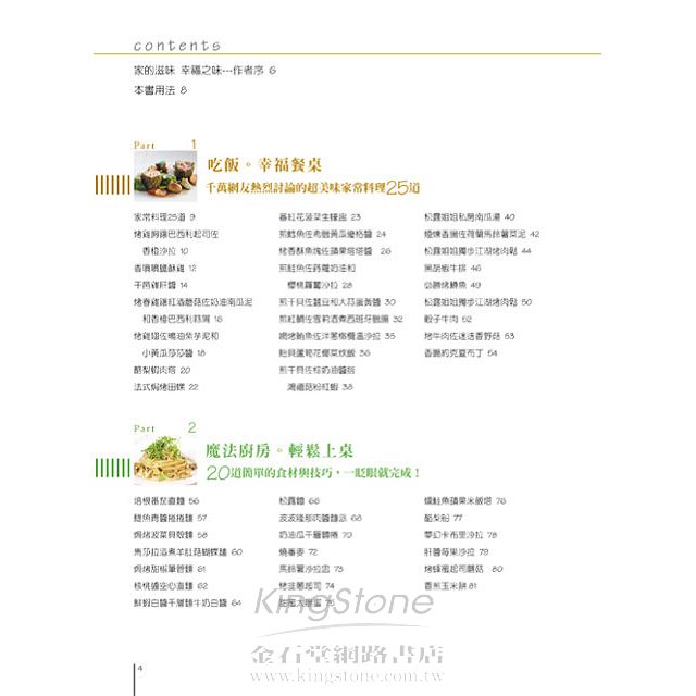 每一道都有詳細配方、完整步驟圖解,更仔細地註明了重點步驟…等資訊,能夠讓你沒有絲毫困惑地充分的享受下廚的樂趣。是一本沒看過可惜、不擁有就落伍的食譜書。