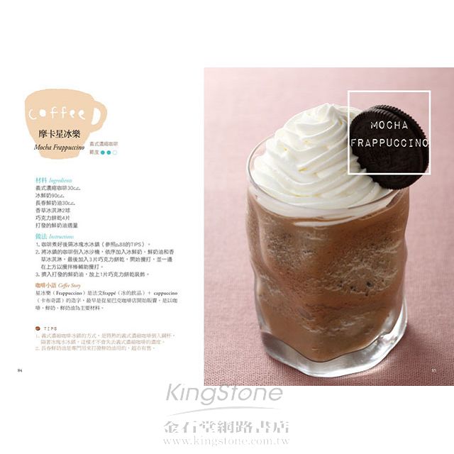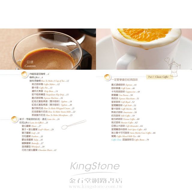 書中的咖啡配方包括3大類:PART1〈一定要學會的經典咖啡〉,像永恆的康寶藍、卡布奇諾、愛爾蘭咖啡、咖啡拿鐵和摩卡咖啡等;PART2〈最受歡迎的花式咖啡〉,舉凡是店家流行的摩卡星冰樂、提拉米蘇冰咖啡、榛果拿鐵咖啡和焦糖瑪奇朵等都在內;PART3〈也來試試流行創意冰咖啡〉有發揮創意的摩卡可可冰咖啡、冰咖啡歐蕾、漂浮冰咖啡和啤酒冰咖啡等,都是好喝又好製作的咖啡。