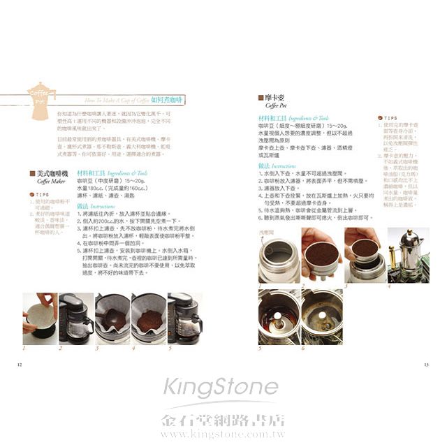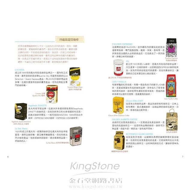 此外,還有選擇咖啡豆、各種咖啡該搭配哪些甜點、四處旅遊時可買哪些咖啡的小常識,讓你邊煮咖啡邊細讀咖啡故事。