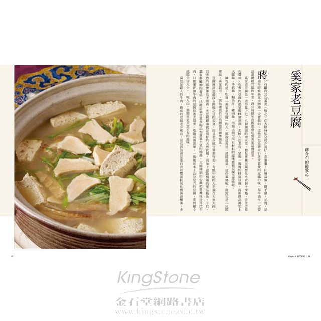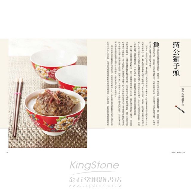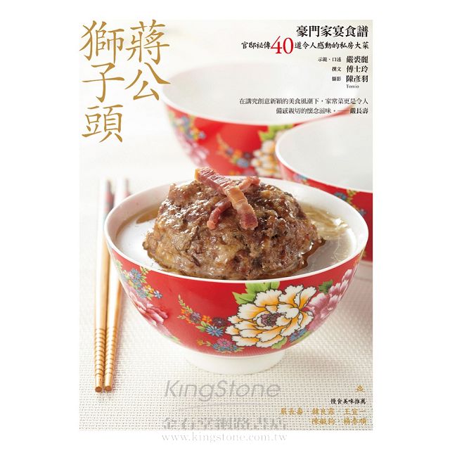 這本書是由奚炎先生的媳婦示範口述,記錄了蔣介石最愛的幾道菜的作法,公開了奚家的私房食譜。曾有機會參與大時代世家生活的奚家媳婦嚴裘麗女士,本身也出自上海世家,對於做菜可說是從小就耳濡目染,在大家庭的廚房練就一身好廚藝。《蔣公獅子頭》不同於一般食譜書的私房菜譜,是以江浙菜為主要菜系的奚家家傳菜色,可看到其中記載的不論是蔣介石最愛的「砂鍋蛤蜊獅子頭」、「奚家老豆腐」,甚或是一道「紅燒肉」,都有家庭廚房才可能得見的平凡與不凡。──王宣一