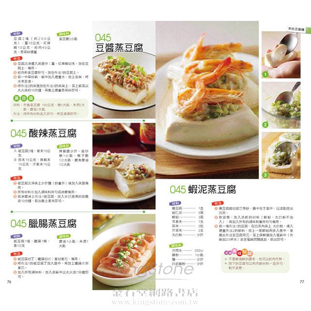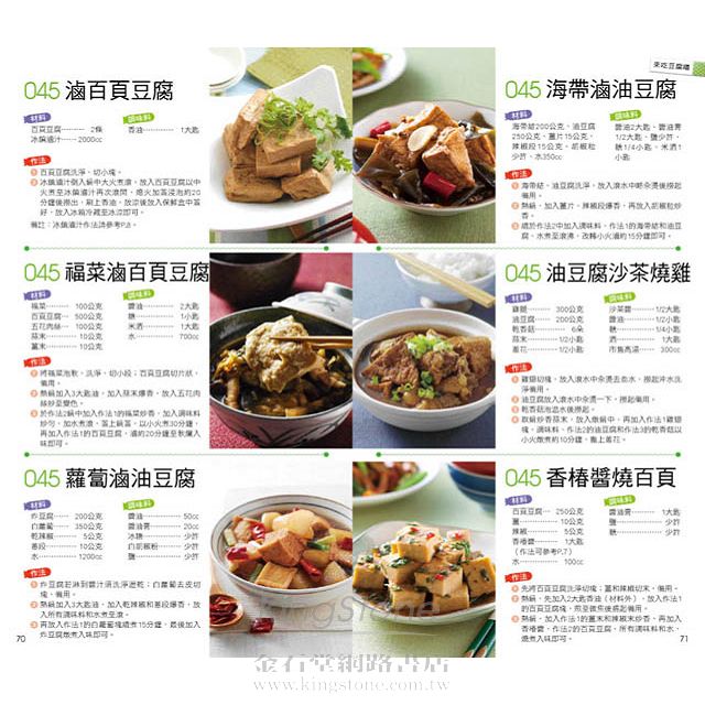 滷豆干、五香小豆干、蜜汁黑豆干、煙燻豆干、丁香豆干、豆豉蘿蔔豆干、雪裡紅炒豆干丁、香根炒干絲、素炒什錦絲、雜燴醬、官印豆干炒芹菜、糖醋豆干、蒜苗辣炒干丁、桔醬肉片黃豆干、椒鹽黃豆干、辣豆瓣炒豆干、麻香薑味枸杞子、涼拌干絲、涼拌雙絲、涼拌銀芽豆干、蕃茄炒豆包、山芹豆包黃豆芽、薑汁豆包、茄汁豆包、香煎豆包、腐皮蒸樹子、香煎素鵝、藥膳燉鰻魚、紅油拌腐竹、雪菜拌千張……