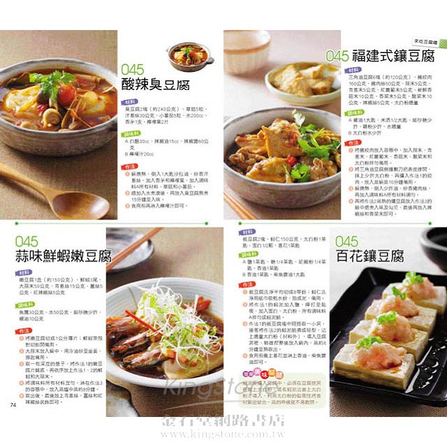 麻辣豆腐丁、韭菜花炒豆腐丁、口袋豆腐、回鍋豆腐、蠔油豆腐、豆腐鬆、番茄燒豆腐、豆醬燒豆腐、蔥燒豆腐、蒜燒臭豆腐、糖醋臭豆腐、福菜苦瓜燜臭豆腐、泡菜油豆腐、韭菜油豆腐、辣味炒油豆腐、豬肉照燒油豆腐、蠔油雞丁凍豆腐、薑汁豆腐燒、橙汁素排骨、蠔油百頁豆腐、咖哩百頁、香脆蛋豆腐、日式炸豆腐、酥炸百頁豆腐、綠茶炸豆腐、枇杷豆腐、豆腐黃金磚、乳酪煎豆腐、豆漿焗豆腐、鮮焗豆腐、麻辣腸旺臭豆腐、蝦泥蒸豆腐、京燒豆腐、文思豆腐、麻婆紅白豆腐、八珍豆腐煲、大馬站煲、蟹肉棒煨火鍋豆腐、海鮮豆腐羹、三絲豆腐羹、清香豆腐、蔥油豆腐、酒香豆腐……