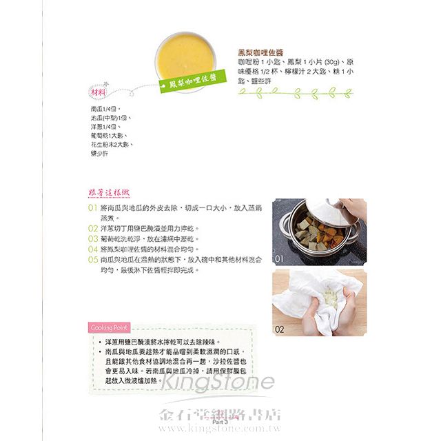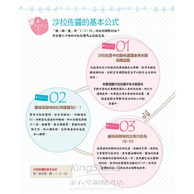 本書不單單只丟給你食譜而已,從事前準備,教你如何選購食材、處理與保存食材,並教你好好把握美味沙拉的5個黃金法則。而在製作沙拉佐醬部分,作者公開私房公式:「糖:食用醋:鹽=1:2:1/2」,只要掌握好搭配食材的特性,並依個人喜好的口感進行調整,你就可以製作出擁有具自己個性的沙拉餐點。