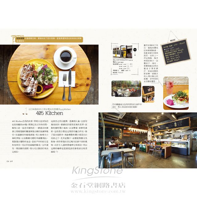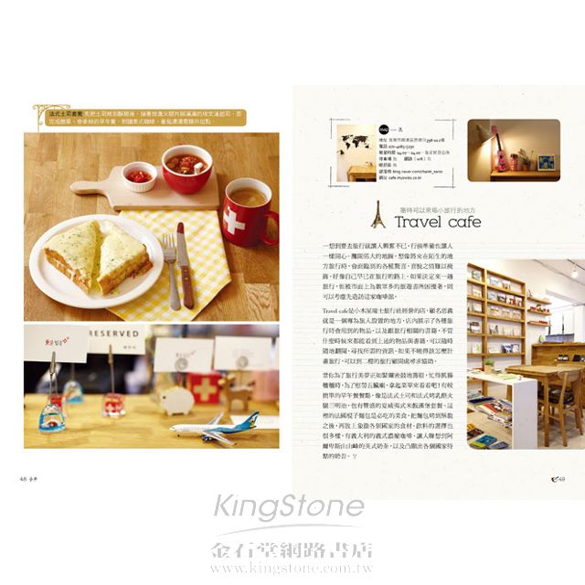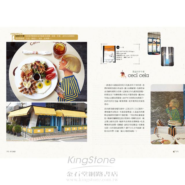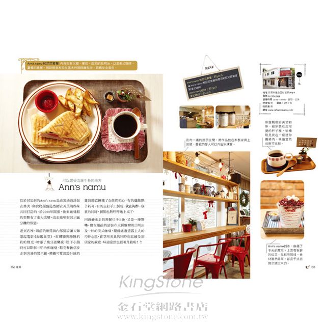 每間咖啡館都各具特色,像是:把電影中出現過的料理實際搬到店裡的CAFE GONDRY;將店內打造成帳棚,讓人彷佛身處郊外的Dining Tent;結合韓式與歐式建築風格裝潢的Dodo&;以少見的印地安料理為主打的Shy bana;餐點、裝潢都走自然風的cafe slobbie;富含人情味的Indigo;以旅行為主題打造的Travel cafe。更收錄了130道人氣早午餐,豐盛的班尼迪克蛋、香氣十足的鬆餅套餐、烤至金黃的帕尼尼、綿密鬆軟的藍莓煎餅等,大大滿足你的味蕾。