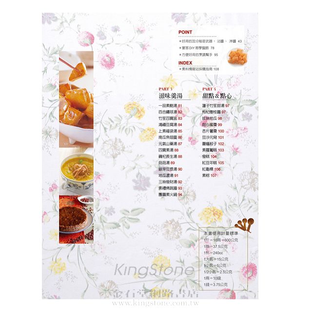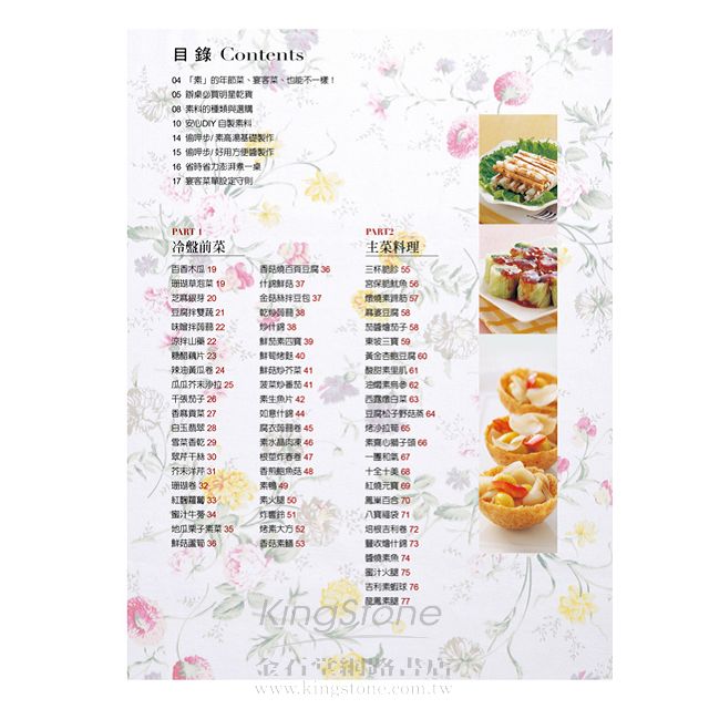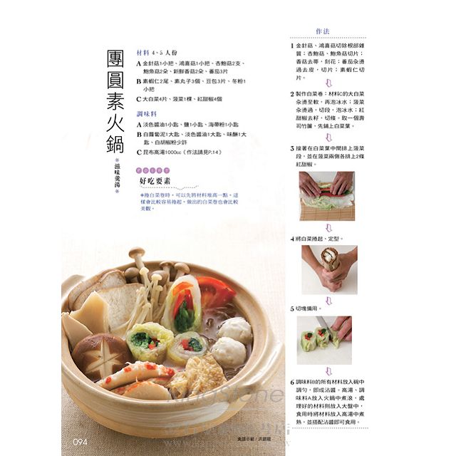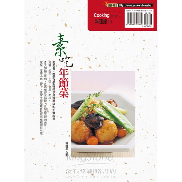 本書提供了百餘道包括前菜、主菜、湯品、點心在內的素食,烹調方式更含括了蒸、炒、煮、炸、煎等手法,不管是日常飲食的需求,還是節慶團員,即便是宴客,也可以從中取得各式菜色風味作參考。