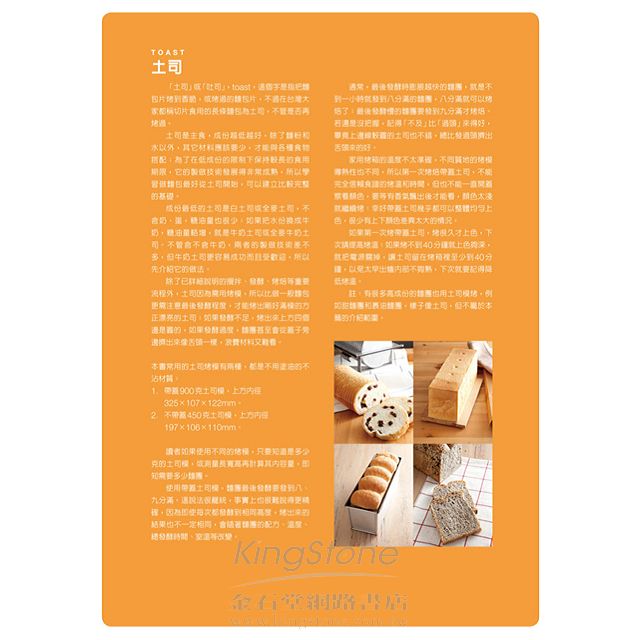 書中將餅乾分為十二個單元:土司類∕餐包類∕傳統甜麵包∕新式甜麵包∕免揉甜麵包∕油炸麵包與調理麵包∕壓麵機麵包,更包括歐式麵包∕披薩類∕裹油麵包∕澱粉麵包…等、以及天然酵母與老麵麵包…。每一個單元都有最完整的介紹,除了詳實的配方外,更附上清楚的步驟圖,再搭配上120分鐘的DVD,每一位讀者都可以沒有困惑的在家製作書中所有的健康麵包。