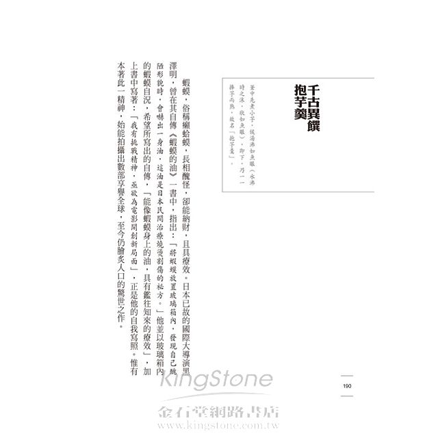 民以食為天,文人雅士更不乏以食取材得吟詠之樂。本書以品評之佳餚與泛談飲食的各樣面向為大類,引述食物典故,從名稱的流變、菜色與製法說起,知味還能識味,讀來舌底生津,口腹之欲有大滿足。