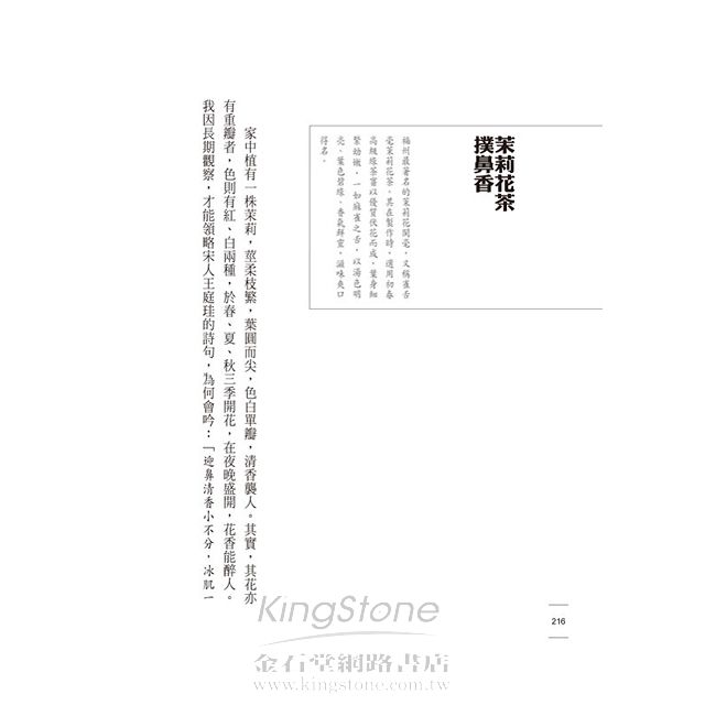 全書共分八輯:「烹食」從東坡肉、烏骨雞到當歸鴨啖起,咀嚼肉之況味;「嚐鮮」海之魚蝦蟹,味蕾鮮之風華;「喫豆腐」溯及豆腐之淵源與料理上的多重變化與融合;「尋味」麵食、酥炸小點與勾人饞涎的玉荷包,看似家常然箇中有味;「聞香」撲鼻而來有茉莉、白糖蔥與臭冬瓜,迷魂者還有酸辣湯。知其典故能食其風雅,「食在生活」談常民飲食要有惜福之心,食前方丈非養生;「食有所聞」溯古至今之飲食面面觀,是以地域之別標榜特色風味者或融合東西方各味之創意料理皆蔚然成風;「食談」中所言品評佳餚要有梗,無味之味亦美味,美食還須佳釀,樽前自獻自為酬,酒珍菜美,饕掏不絕,人生不過如此爾。