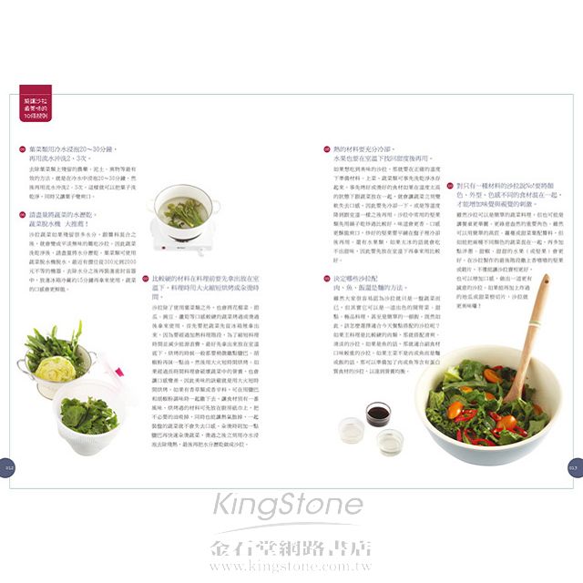 各食材的營養資訊和新鮮保存法、達人才知的料理小撇步、讓美味加倍的10個方法……等,只要掌握這些訣竅,每個人都能端出好吃沙拉!