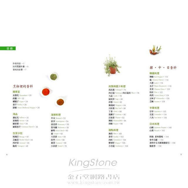 三、盡可能將各種香料的功效與用途清楚呈現。西方國家認為香料是用來調理食物的味道,東方國家卻以健康為目的而將香料作為藥膳食用。因此本書中將研究過去從未注意過的香料,以及具有何種獨特的功效等。